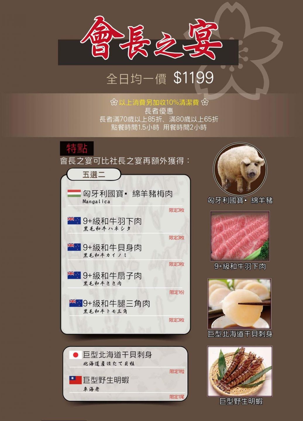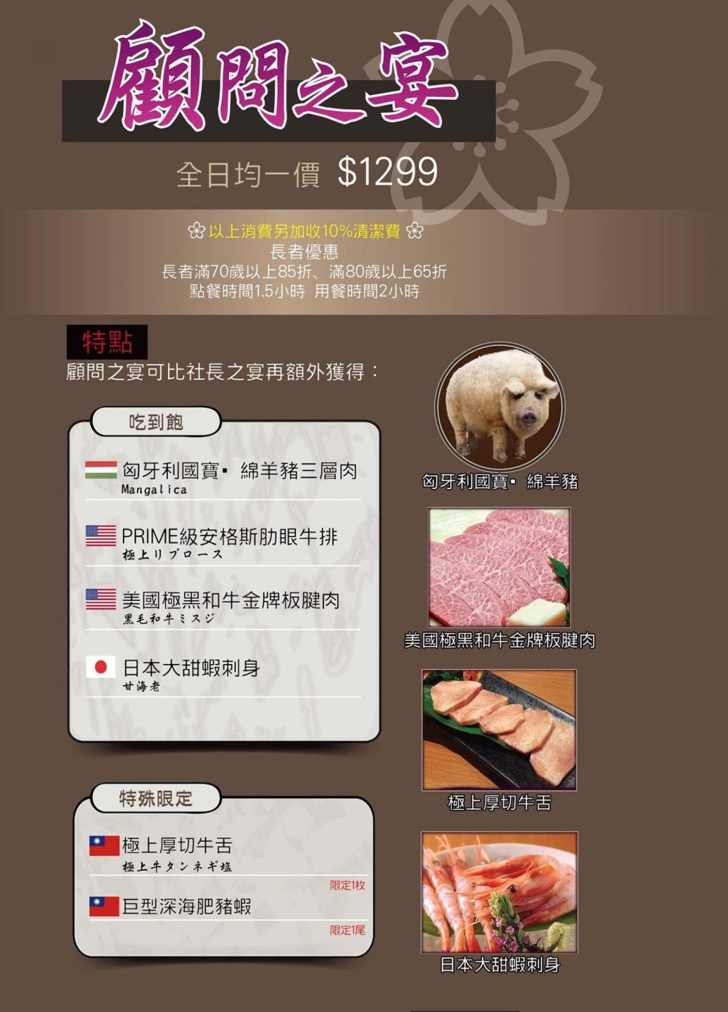 高雄秘町頂級和牛吃到飽訂位專線:七賢店:07-2368666 七賢一路465號美術店:07-5522687 美術東二路79號顧問之宴含服務費1人1500有找,果然厲害哦,極上厚切牛舌太威了,美國極黑和牛板腱肉也超推,有在日本吃的等級哦,很推想好好犒賞自己的朋友來吃比社長再增了幾樣地球上數一數二的珍稀商品...美國極黑和牛、美國PRIME級肋眼、匈牙利國寶豬、日本大甜蝦吃到飽+超限量厚切牛舌1枚、深海野生肥豬蝦1尾。